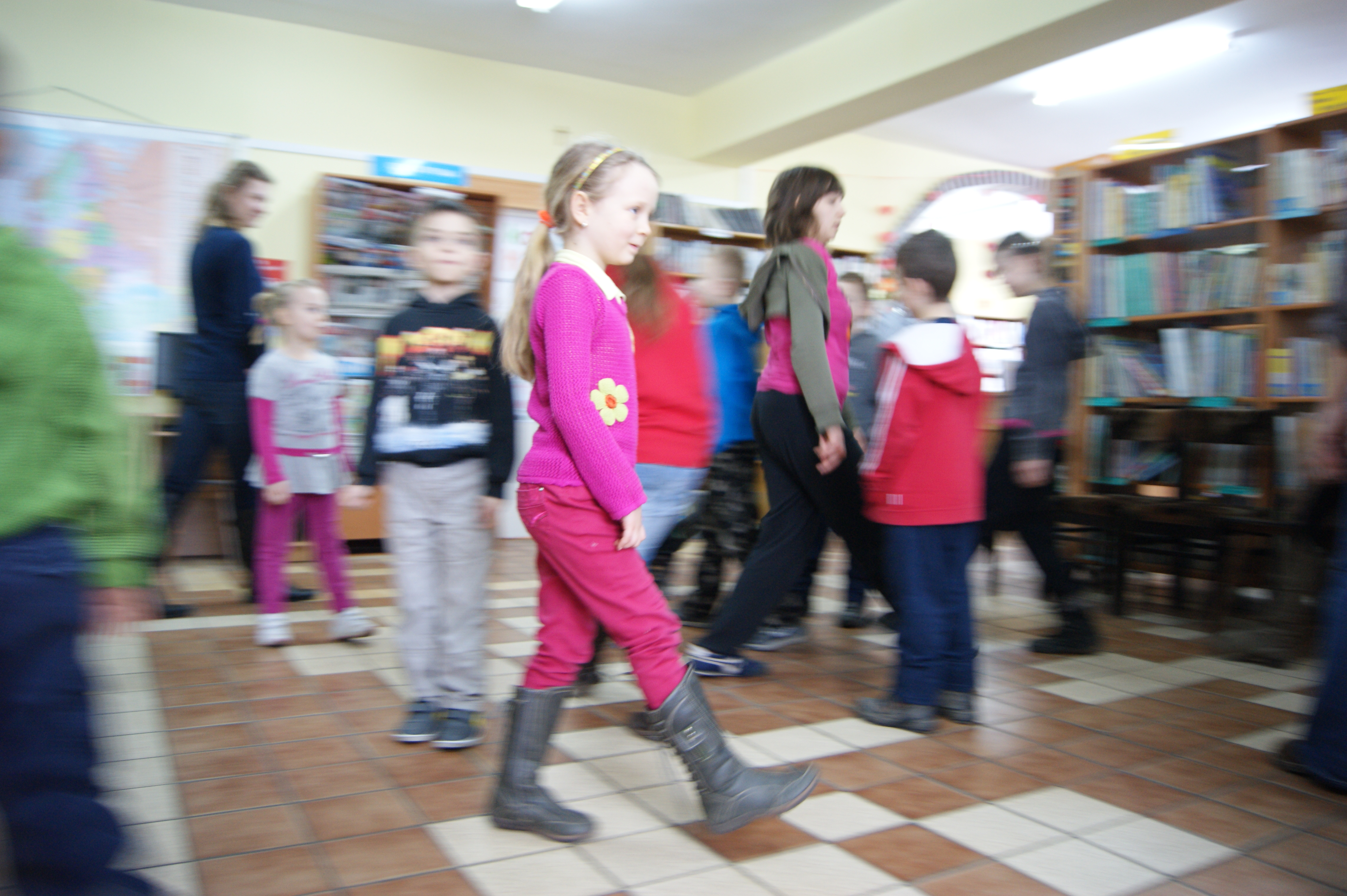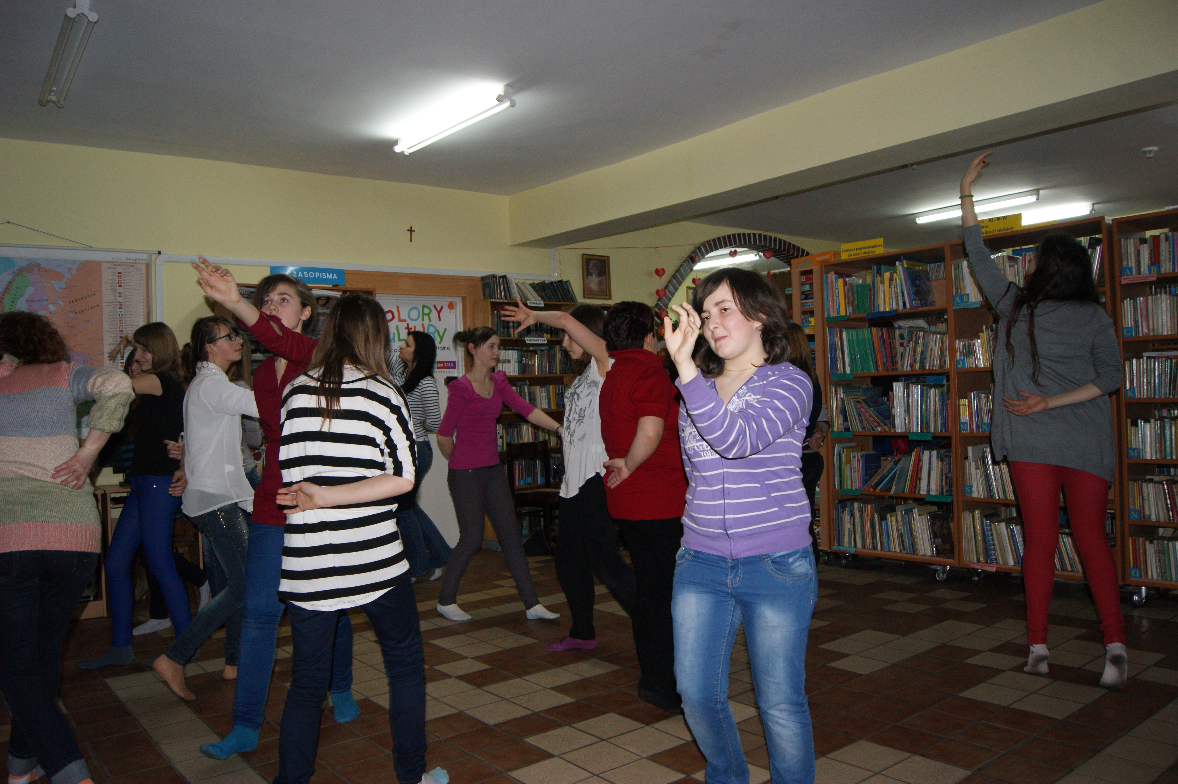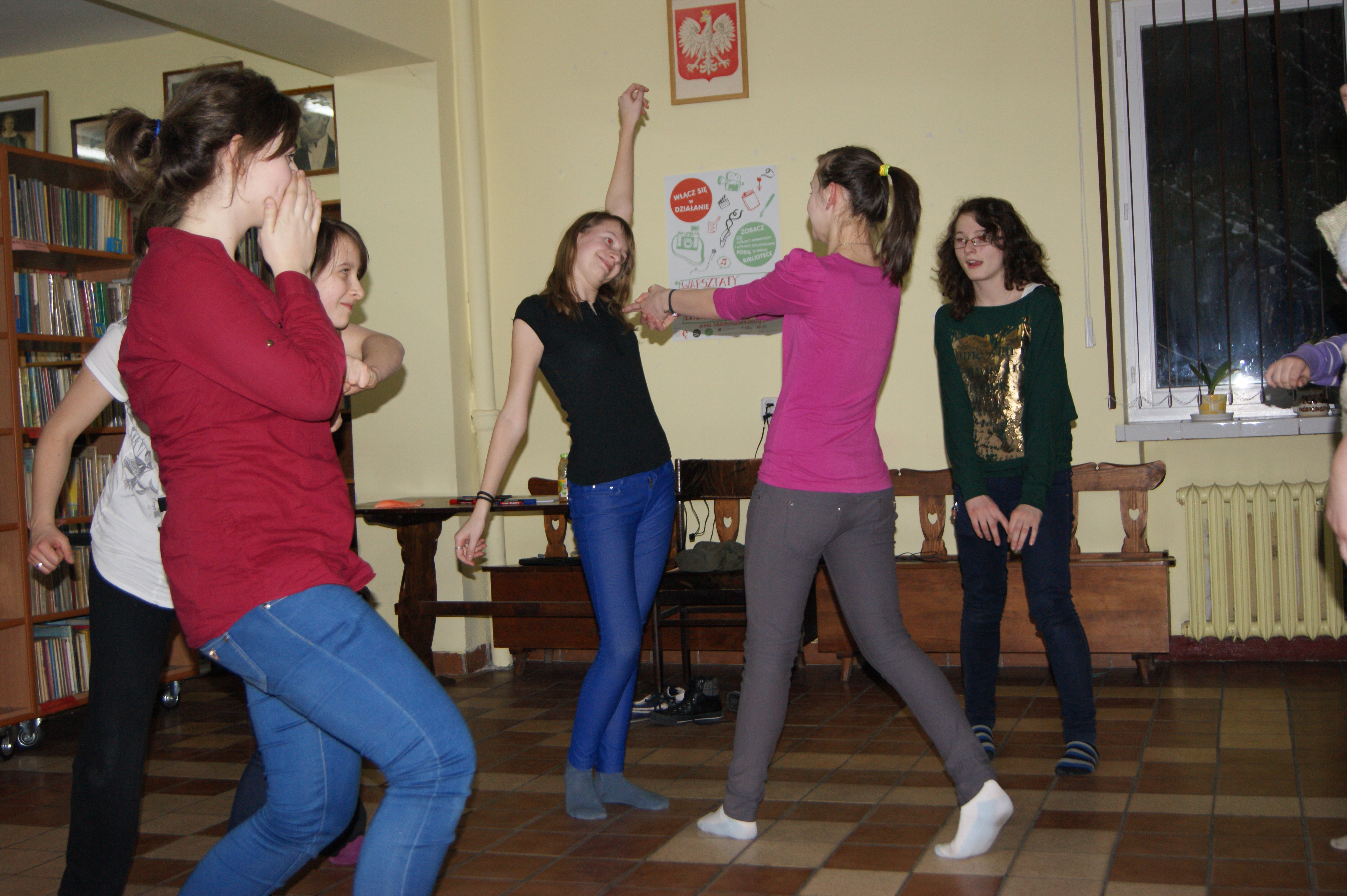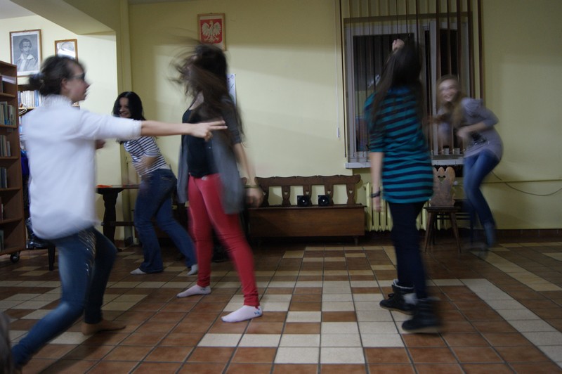 Tym razem odsunęliśmy wszystkie stoły i krzesła na bok (prowadząca zajęcia: Dorota Ogrodzka z Towarzystwa Ę od razu zapowiedziała nam że nie będzie żadnego siedzenia 🙂 ), by wygospodarować jak najwięcej miejsca…no i zaczęło się.