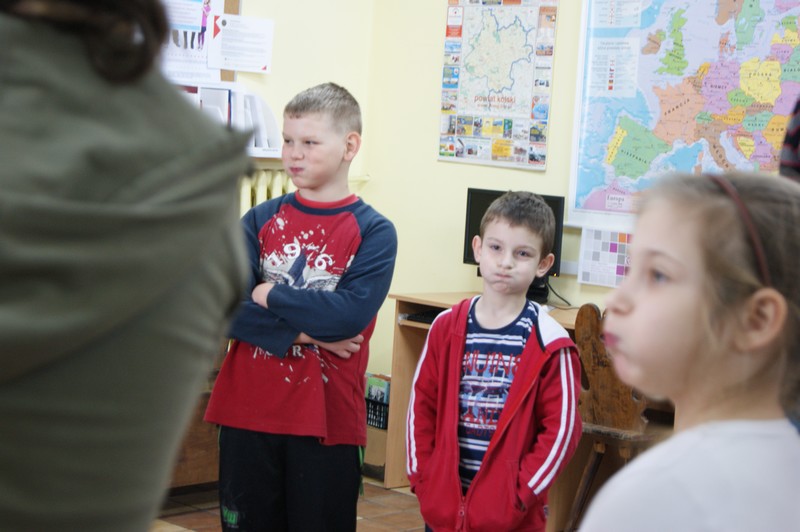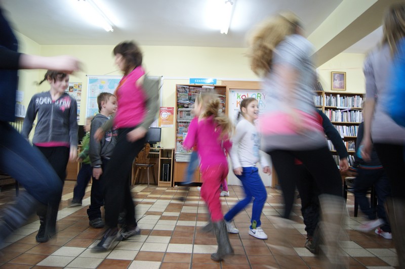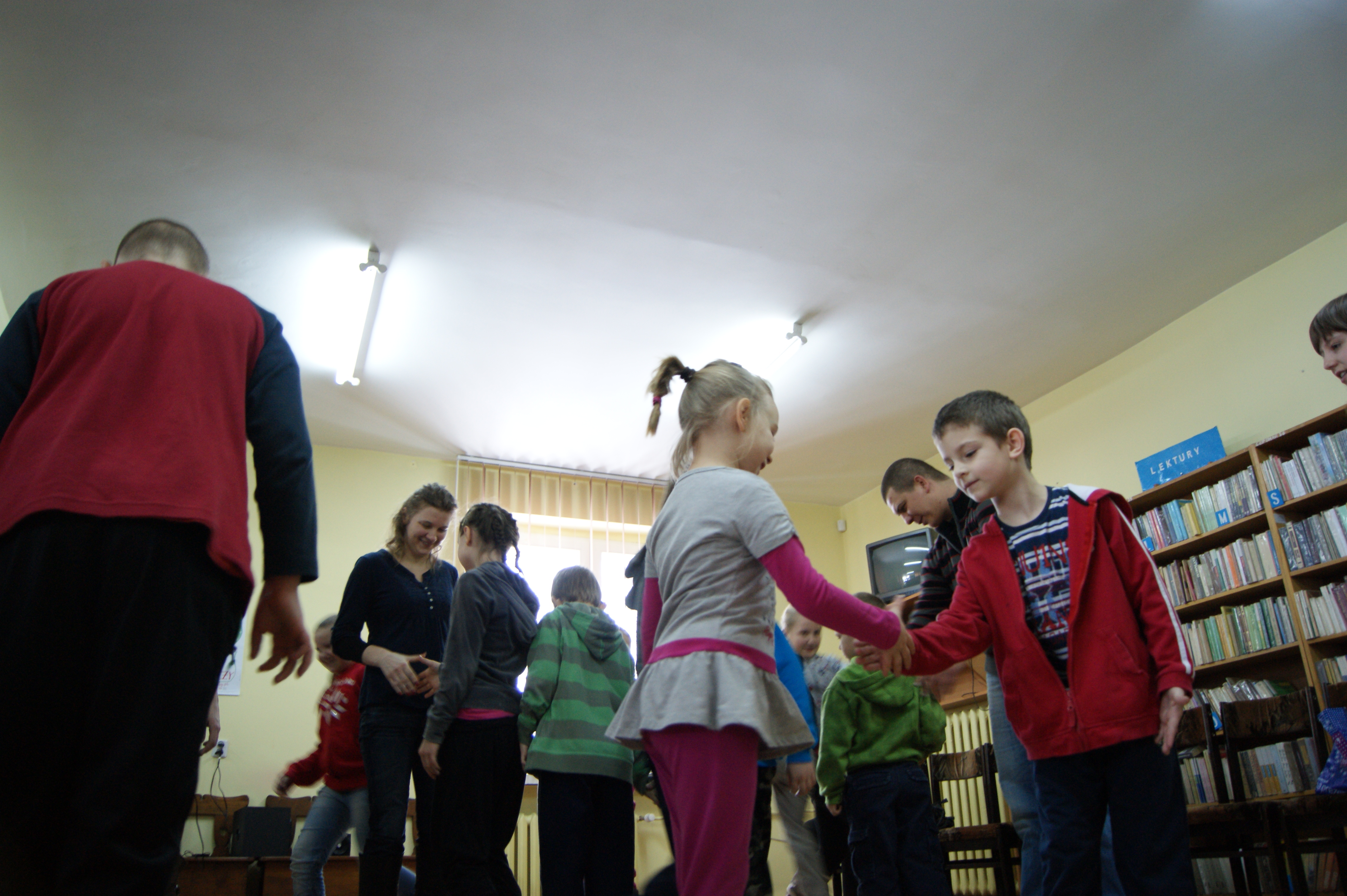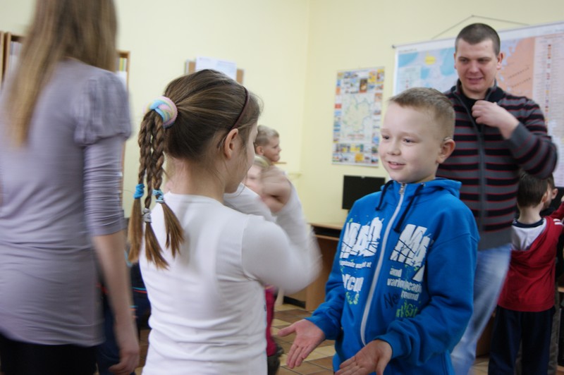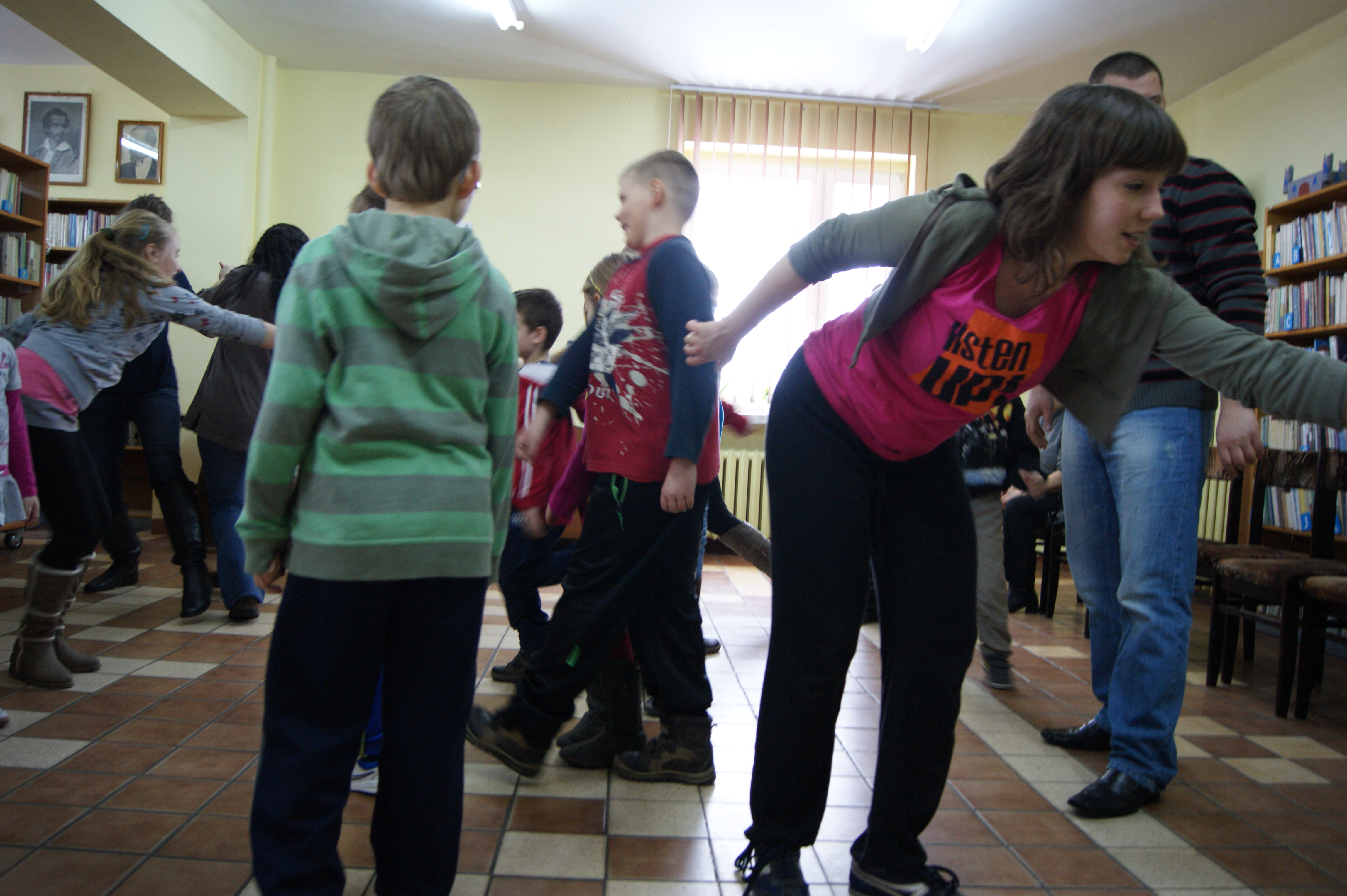 Tym razem odsunęliśmy wszystkie stoły i krzesła na bok (prowadząca zajęcia: Dorota Ogrodzka z Towarzystwa Ę od razu zapowiedziała nam że nie będzie żadnego siedzenia 🙂 ), by wygospodarować jak najwięcej miejsca…no i zaczęło się.