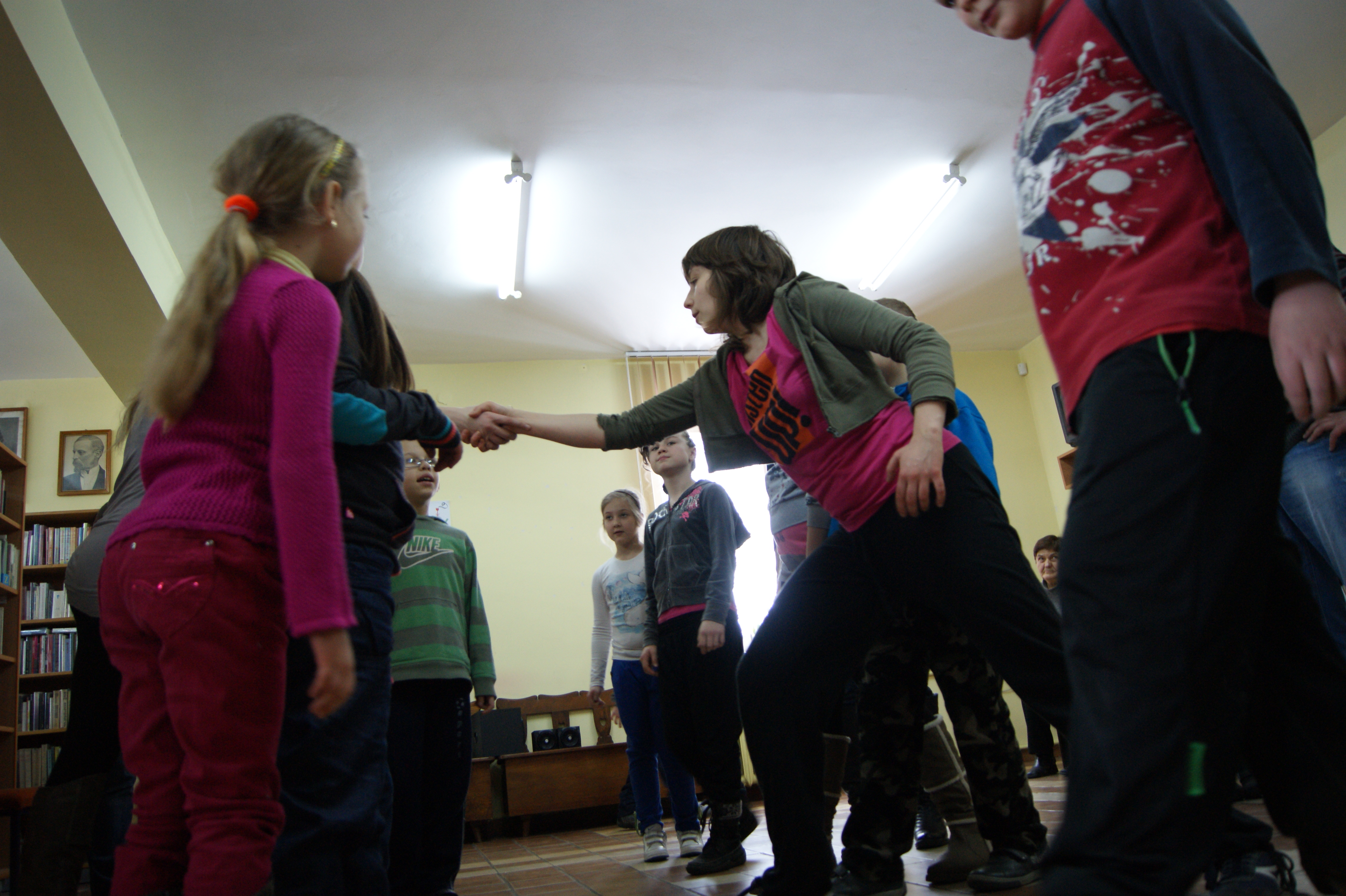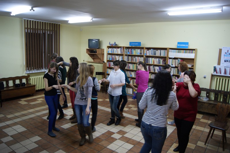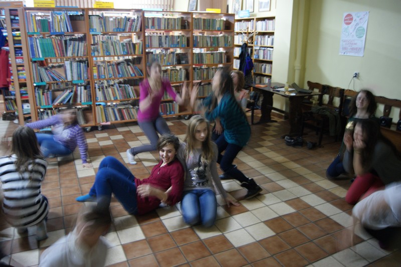 Było to pierwsze dwudniowe spotkanie, w ramach współpracy Biblioteki z Towarzystwem Inicjatyw Twórczych Ę. Współpraca biblioteki dotyczyć będzie teatru i zajęć teatralnych – ponieważ na takie zajęcia znalazło się najwięcej chętnych. Główną grupą, do której skierowana jest oferta Towarzystwa Ę – jest młodzieżowa grupa teatralno-muzyczna, która zawiązała się przy bibliotece po warsztatach jakie odbywały się w ferie pod nazwą KOLORY KULTURY. Grupa liczy 15 dziewcząt.